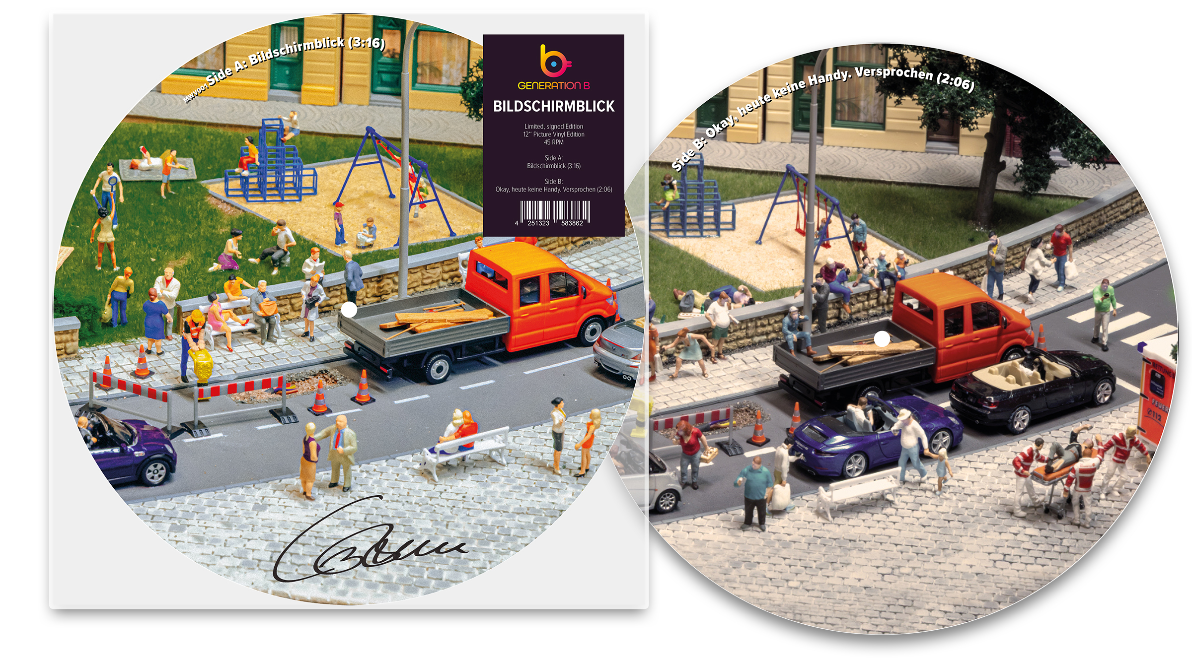 Die Vinyl "Bildschirmblick" mit der A-Seite, die das heutige Leben mit dem Smartphone zeigt, und die B-Seite, das Leben früher.